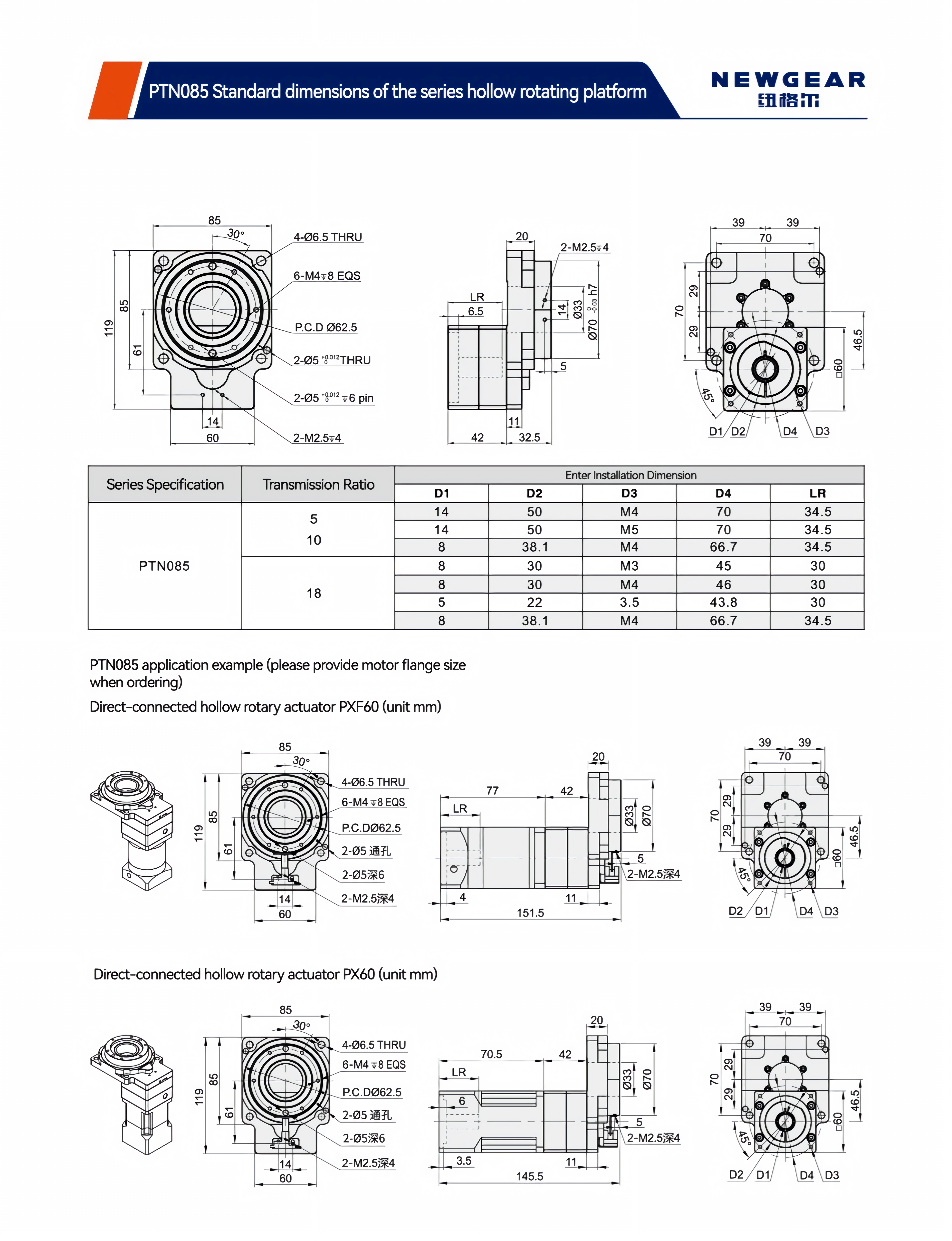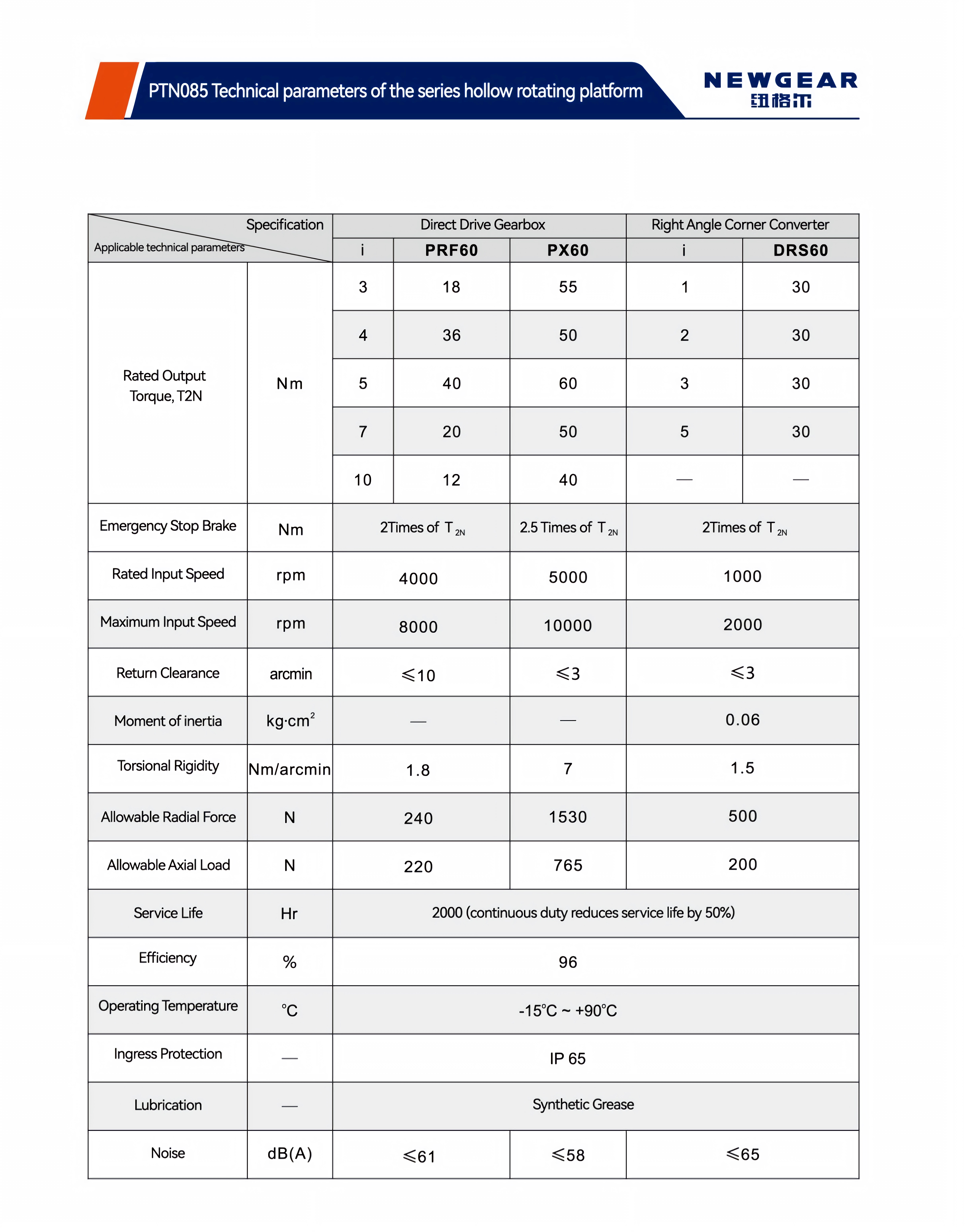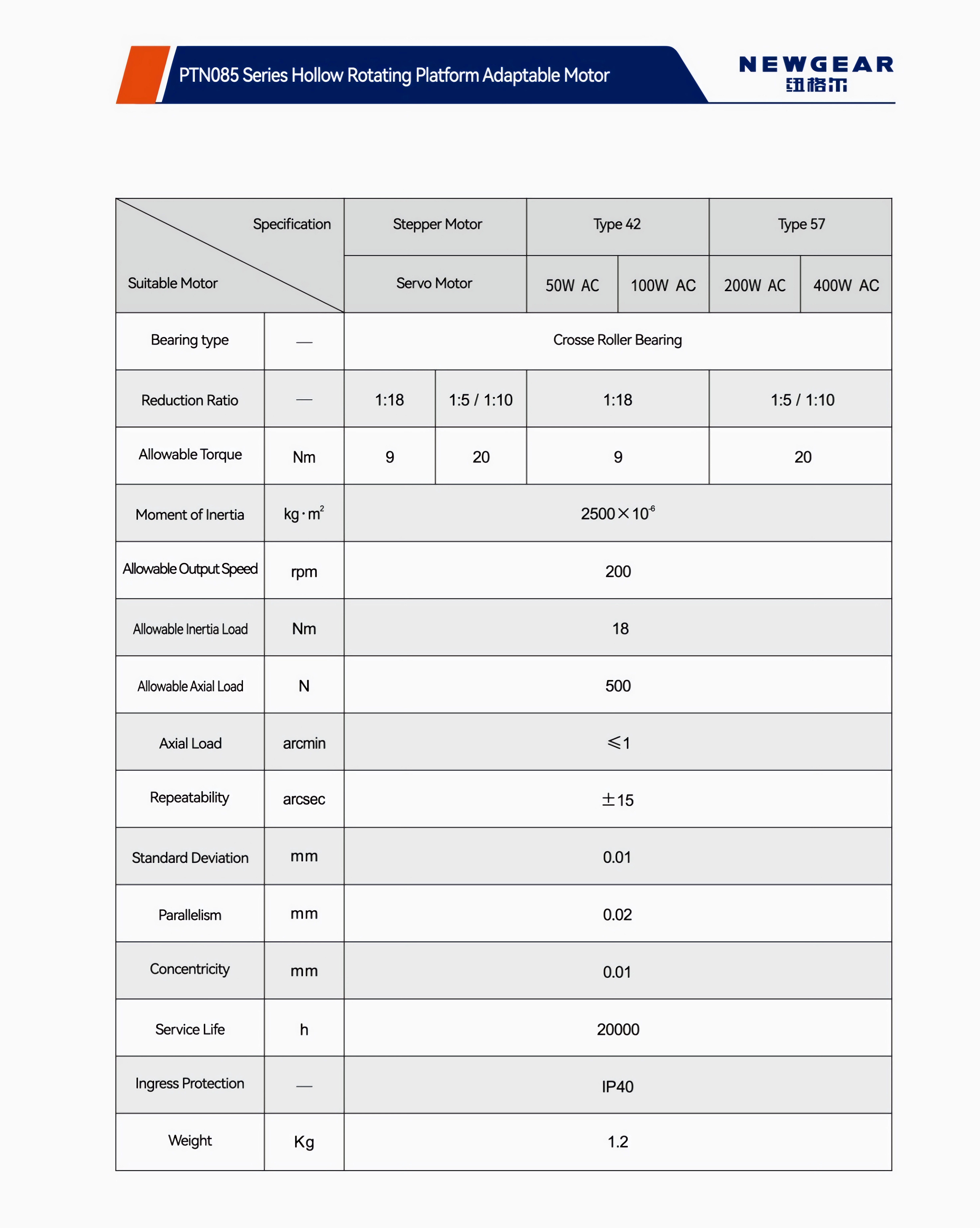La PTN085 è una tavola rotante cava versatile, compatibile con motori passo-passo NEMA 17 e 23 e servomotori CA da 50 W a 400 W. Offre rapporti di riduzione di 5, 10 e 18:1, con un gioco di ≤1 arco-minuto e una ripetibilità di ±15 arco-sec. Realizzata con una struttura rigida con cuscinetti a rulli incrociati e un design a foro passante, garantisce un'elevata capacità di carico e un facile passaggio dei cavi. Con grado di protezione IP40, è adatta per ambienti industriali generici. Inoltre, può essere abbinata in modo flessibile ai nostri riduttori epicicloidali PX60/PRF60 per estendere le opzioni di coppia e rapporto di velocità, offrendo una soluzione rotante robusta e adattabile per diverse applicazioni di automazione.